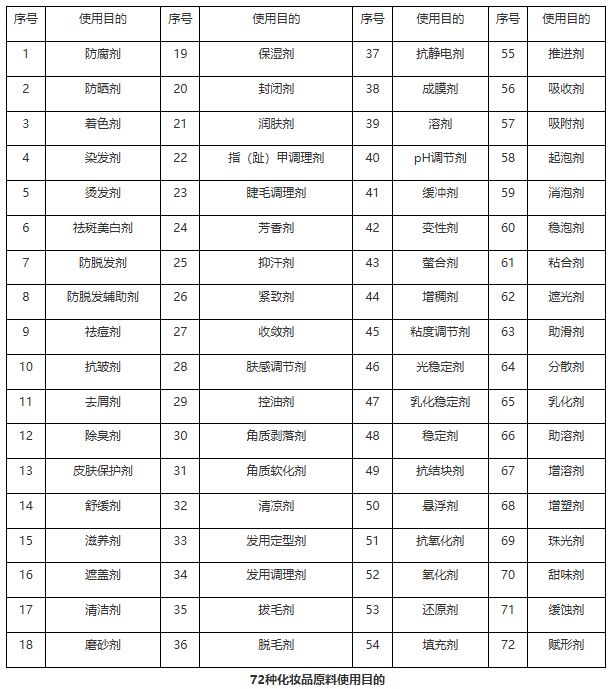 答:《化妆品原料使用目的技术指南(试行)》附表为《化妆品原料使用目的目录》(以下简称《目录》),包括72种原料使用目的及说明。《目录》是在充分参考国外相关标准的基础上,依据我国现行法规标准以及行业使用情况等进行制定。使用目的具体如下: