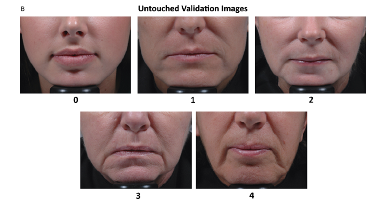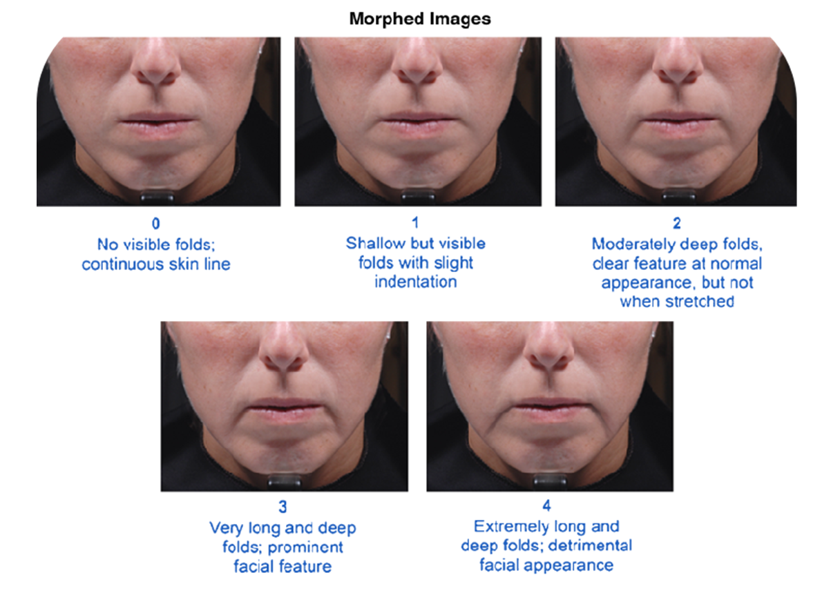 开发了一个五级图谱评分量表(5-point photonumeric rating scale),用于客观量化木偶纹(Melomental folds)的严重程度。9位专家对35名受试者的照片进行了两次评估,分别比较了原始图谱与演变图谱中的木偶纹(marionette lines)。通过计算组内相关系数来评估组间和组内的变异性。