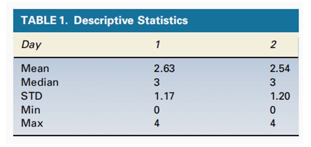 对每日评分进行描述性统计(标准差、平均值、中位数、最大值和最小值)计算(见表1)。评级的稳定性以双变量散点图(气泡图)的形式进行可视化。气泡图是一种在散点图上表示变量间关系的方法。两个变量的观测值以常规方式绘制,使用圆圈作为符号;圆圈的半径与第三个变量的关联值成比例。给定分数的频率决定了气泡的大小,这些气泡理想地位于对角线上。