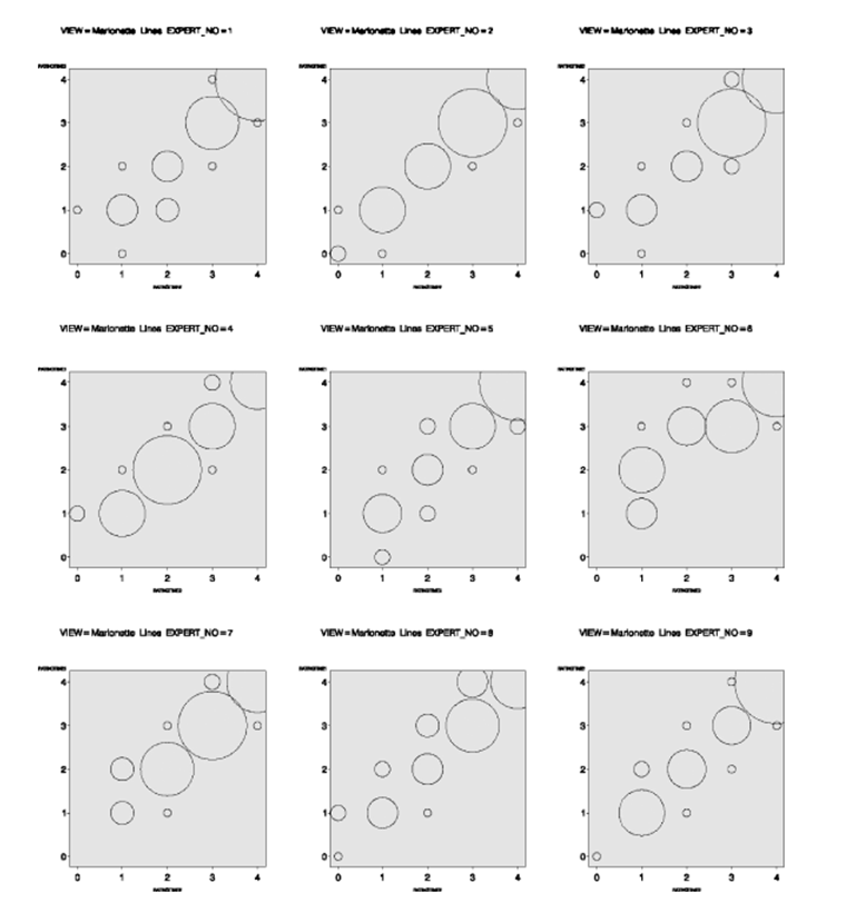 九位美容医学领域的专家根据真实人物照片(图1B)中呈现的“木偶线”特征,对35个案例进行了评估,并与经过变形处理的图像进行了对比。演变图像显示了定义的长宽比的阶梯式变化。在初始培训会议和实践案例的讨论之后,每个专家在连续两天内独立地对35个案例进行评估。将数据双重输入数据库,并检查其正确性。