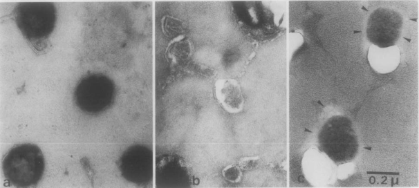 图3 皮质层中的黑素体(所有图均为相同放大倍数):不游泳女性头发(a)。游泳运动员金色头发,黑素体形状、大小不规则且边界模糊(b)。游泳运动员金色头发,黑素体带有白色晕圈(箭头所示)(c)。