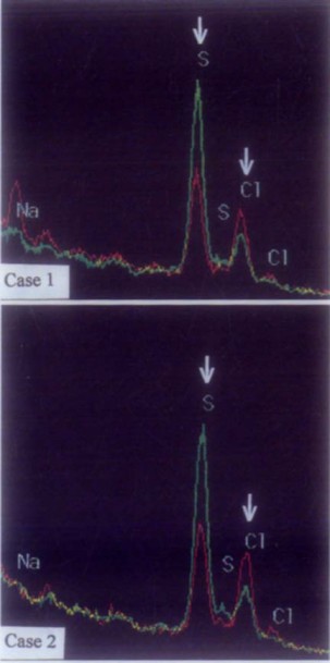 X射线能谱结果显示,游泳运动员的金色头发中,氯元素的吸收峰增高,而硫元素的吸收峰则呈下降趋势。进一步聚焦于皮质层中的黑素体时,在所有游泳运动员的金发中均检测到氯元素,而相同测试未能在不游泳人群的头发中检测到氯元素。当聚焦于不包含黑素体的皮质层细胞时,仅有2个游泳运动员样本含有少量氯元素。